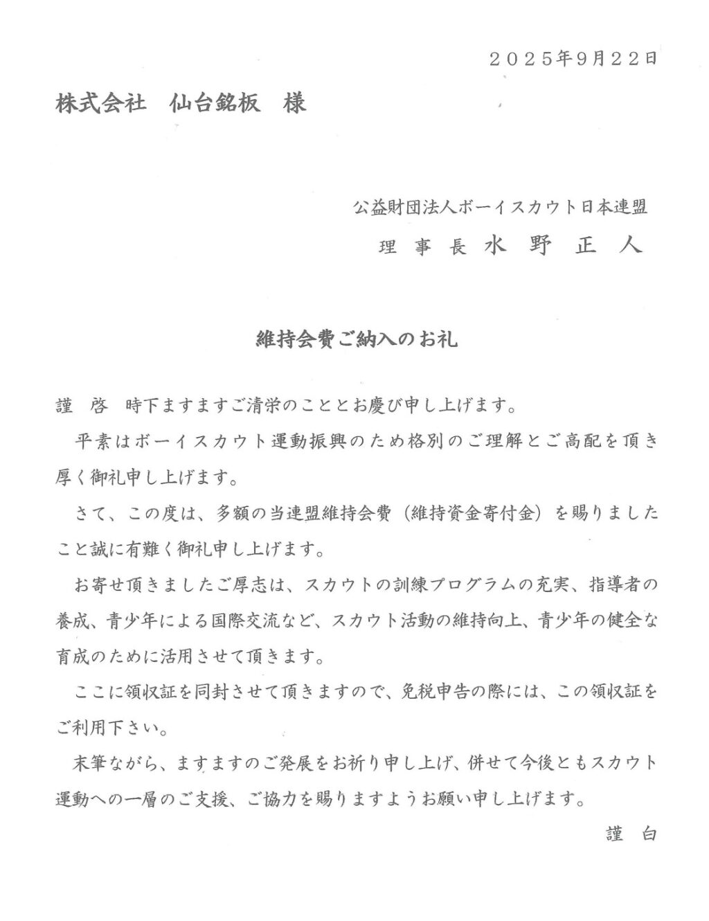 ボーイスカウト日本連盟様よりお礼状が届きました